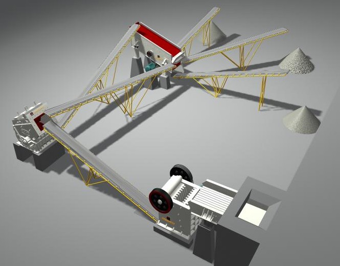 石子破碎生產(chǎn)線的生產(chǎn)流程大致為:(料倉)->振動給料機->鄂式破碎機->反擊式破碎機->振動篩->(成品石料),各設備中間以溜槽或皮帶輸送機相連。