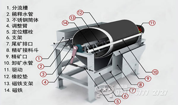當(dāng)?shù)V物顆粒和脈石顆粒通過鉀長石除鐵磁選機(jī)磁場時(shí),由于礦粒的磁性不同,在磁場的作用下,它們運(yùn)動(dòng)的方式不同。磁性礦粒受磁力的吸引,附著在除鐵機(jī)的圓筒上,被圓筒帶到一定的高度后,脫離磁場從筒上利用高壓沖洗水沖落。非磁性顆粒(脈石顆粒)在除鐵機(jī)磁場中不受磁力的吸引,因而不能附著在圓筒上。除鐵機(jī)得到兩種產(chǎn)品,一種是磁性產(chǎn)品進(jìn)人尾礦箱,另一種是非磁性產(chǎn)品進(jìn)人精礦箱,這樣就可以對鉀長石進(jìn)行提純。