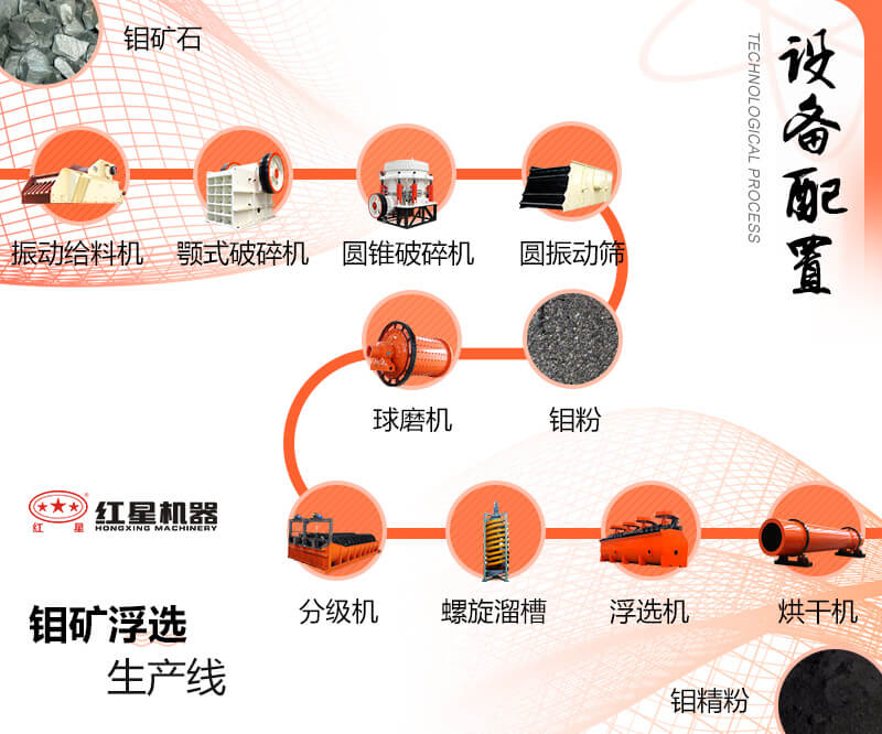 開采而來的天然鉬礦首先要經(jīng)過鄂式破碎機(jī)的粗碎,進(jìn)行初步的破碎,隨后將符合粒度要求的鉬礦物料經(jīng)圓錐破碎機(jī)進(jìn)行再次的細(xì)碎,合格的物料經(jīng)提升機(jī)送至料倉等待研磨。由給料裝置將物料送入球磨機(jī)進(jìn)行研磨,隨后將研磨后的鉬礦細(xì)料送入螺旋分級(jí)機(jī)進(jìn)行洗凈和分級(jí),隨后經(jīng)由攪拌桶送至浮選機(jī)進(jìn)行浮選作業(yè),浮選作業(yè)主要將所需礦物與其他礦物分離開,最后通過高產(chǎn)濃縮機(jī)將礦物中的水分去除,就得到了生產(chǎn)所需的鉬礦原料。