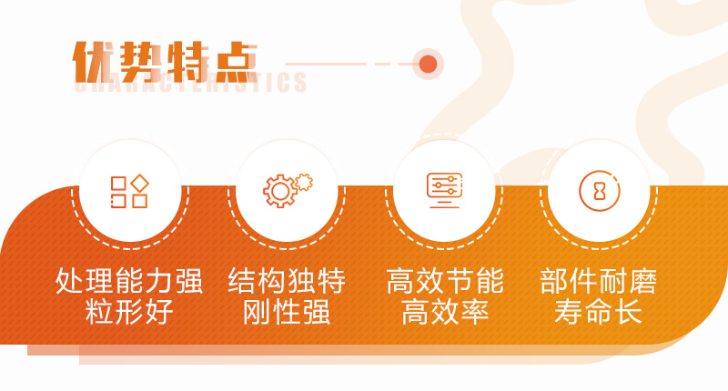 進料口大、破碎腔高、適應物料硬度高、塊度大、產(chǎn)品石粉少。